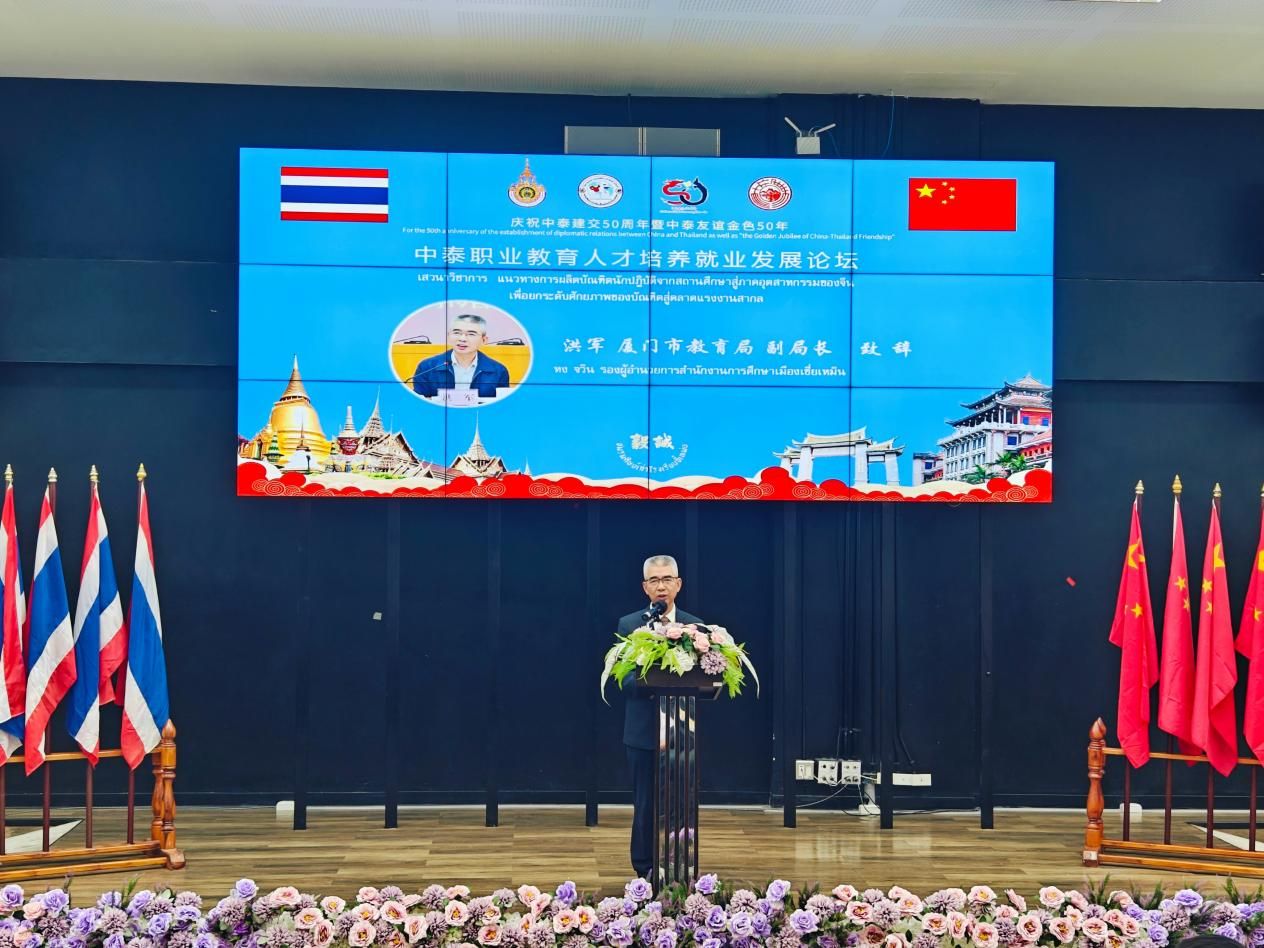 论坛上,素万纳普皇家理工大学校长巴慕克·温那拉卡、集美工业学校副校长黄晓锋、厦门南洋职业学院副校长李振杰、泰国开放教育集团总经理赵国翔发表演讲,并就校校企合作模式进行座谈。