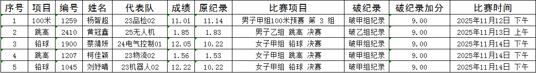 田径丙组团体总分前8名:25高职应化01、25高职制造01、25高职网络02、25高职新能源02、25高职智控02、25高职新能源01、25高职机器人02、25高职智控01。
