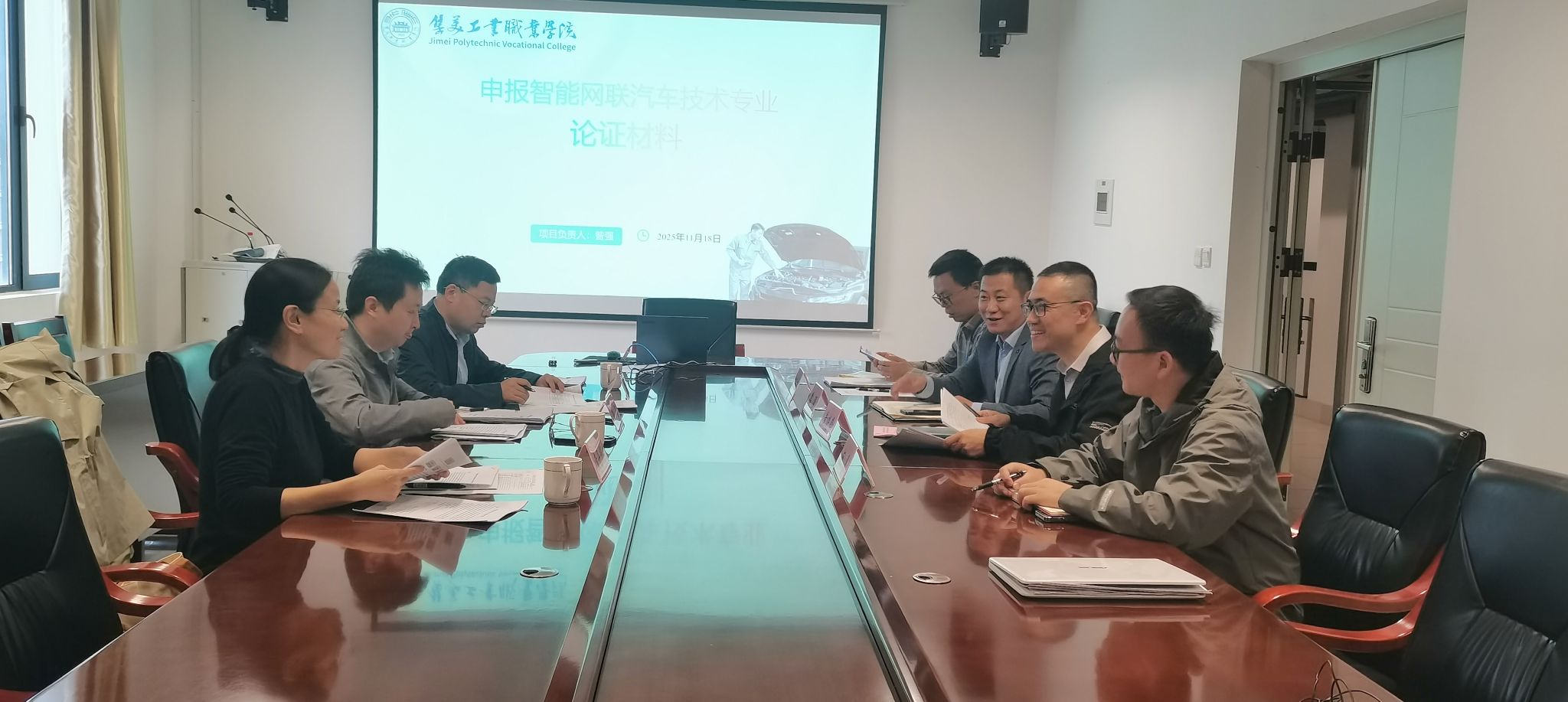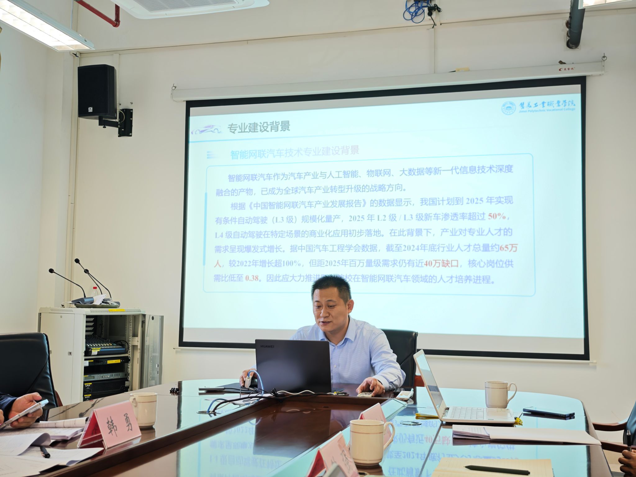 随后,学校昝强老师详细汇报了智能网联汽车技术专业的申报论证材料。汇报围绕专业设置背景、人才培养目标、课程体系构建、师资队伍建设、实训条件规划、教学质量监控等核心内容展开,系统阐述了专业如何紧扣行业需求,构建“理论 + 实践”一体化的人才培养模式,以及在服务产业、促进学生就业等方面的规划与举措。