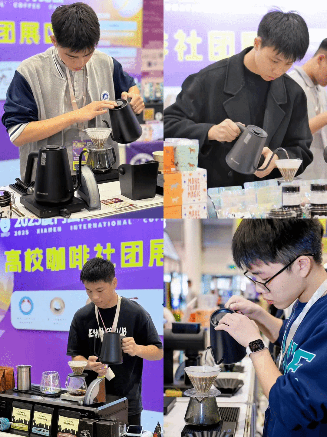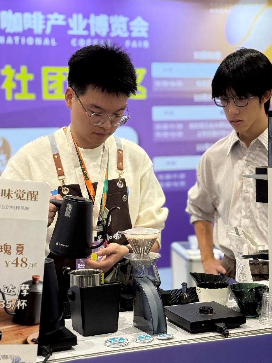 展会期间,更迎来了高校咖啡社团的“年度团圆时刻”。集美工业职业学院精品咖啡协会与厦门大学嘉庚学院咖啡社、哈尔滨工业大学Saturn咖啡研习社、上海交通大学一九咖啡协会、云南农业大学咖啡协会成功会师,五校社团以咖为媒,共赴行业之约。哈工大咖啡社代表潘博士、上海交大一九咖啡协会张锡玥会长、厦门大学嘉庚学院咖啡社黄嘉定会长与我校协会会长易哲宇先后带来手冲技艺分享,现场干货满满;联合组织的六场场专业咖啡杯测会中,云南著名咖啡品牌炬点咖啡赞助的优质豆品搭配上海励品实业提供的专业杯测杯和咖啡分享杯,让各校社员和参展观众在严谨的品鉴流程中交流风味感知、切磋品鉴技巧。杯测之余,各校咖啡社团代表围绕组织运营、活动创新、校园咖啡文化普及等话题深入探讨,碰撞出诸多兼具创意与可行性的合作灵感,为高校咖啡文化的联动发展注入新动能。