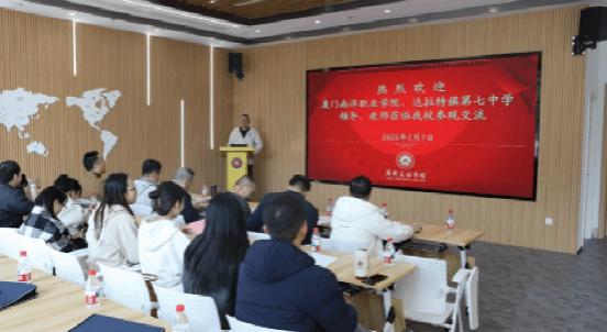 为落实国家产教融合发展战略、加快打造产教融合新高地,1月7日上午,厦门南洋职业学院、内蒙古达拉特旗产教融合领航研学班(第三期)一行18人赴我校开展考察交流活动。我校副校长黄晓锋,办公室主任杨勇,教务处主任孙跃岗、招生与社会培训处副主任钟伟等相关职能部门负责人热情接待了来访嘉宾。双方就产教融合、协同育人等议题展开深入交流。