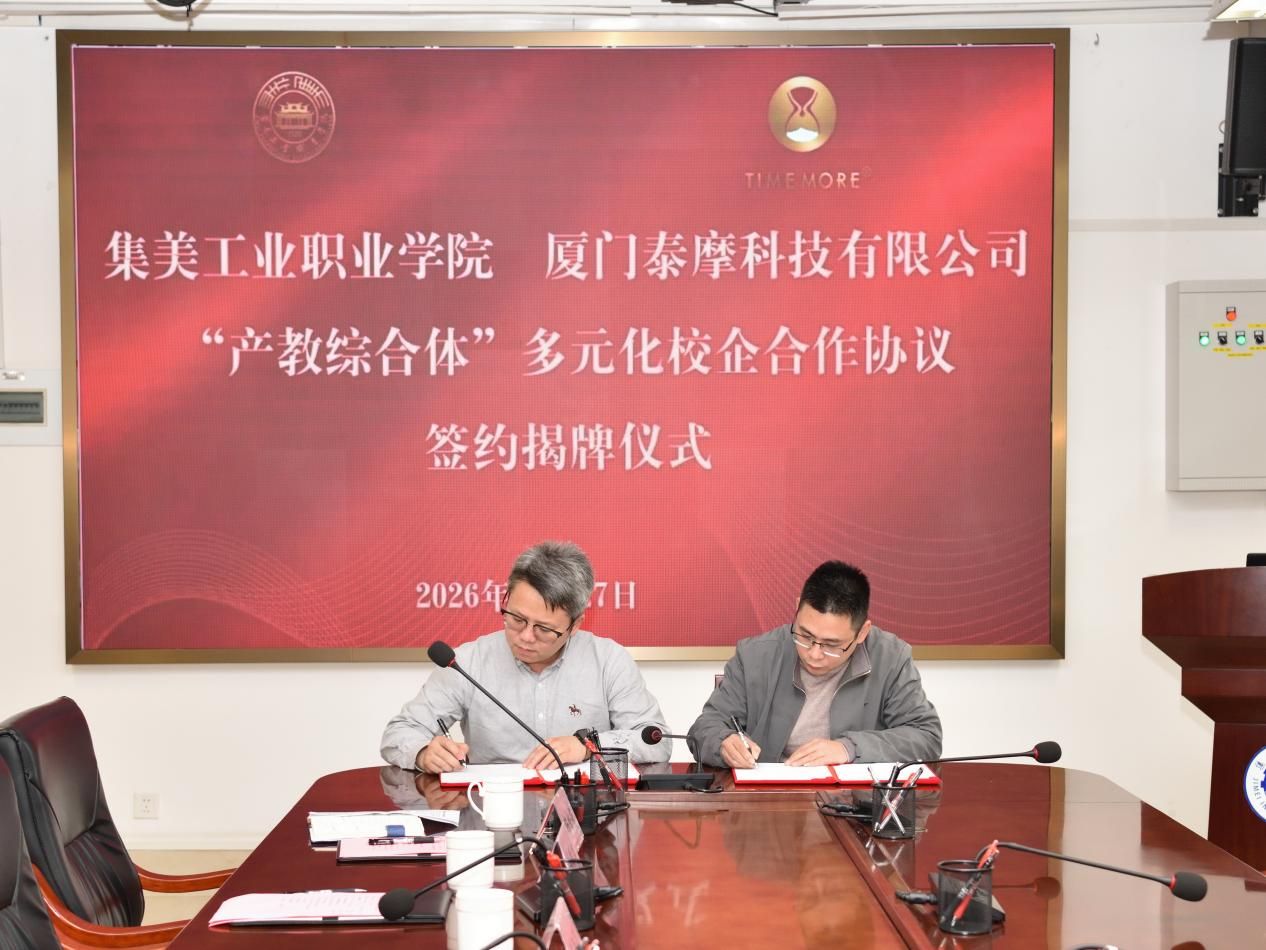 1月27日下午,集美工业职业学院与厦门泰摩科技有限公司“产教综合体”校企合作签约揭牌仪式在学校隆重举行。双方正式签署多元化合作协议,并揭牌设立产教融合实践基地。此次合作旨在依托双方优势资源,共同探索设立“咖啡生态产业学院”,打造集人才培养、技术创新与产业服务于一体的特色产教融合平台。