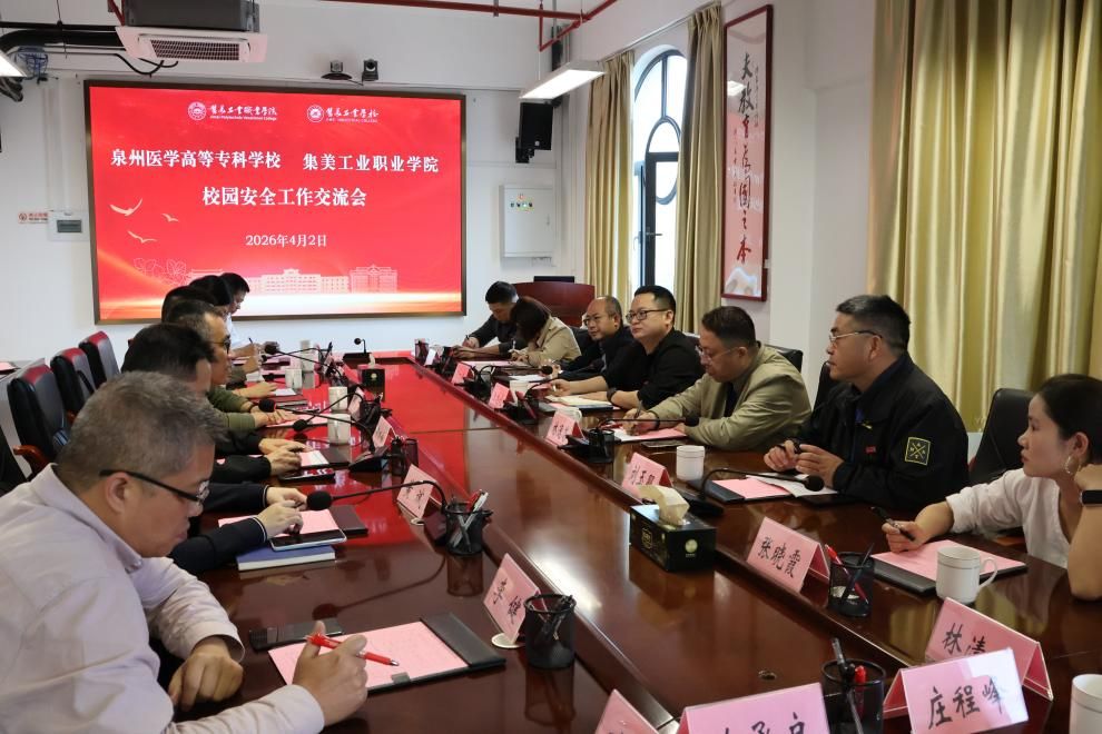 4 月 2 日,泉州医学高等专科学校副校长林迳苍率保卫处、教务处、基础医学部、科技中心等部门负责人,莅临我校调研校园安全建设工作。集美工业学校副校长黄晓锋及教务处、保卫处、科技信息处等相关负责人参加交流活动。